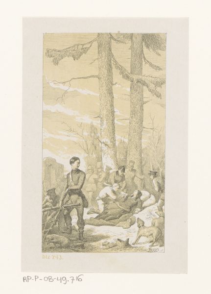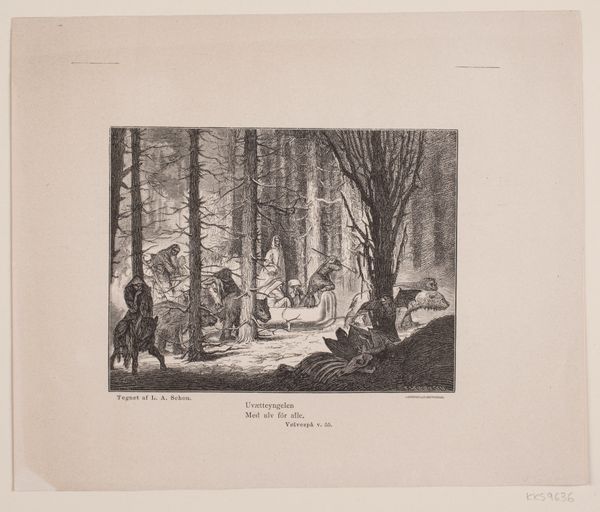 Editor: Here we have Willem Wenckebach's "Christiaan Drosselmeier en de sterrenkundige lopen over een bospad," created in 1898. It’s an engraving, ink and pencil on paper. I’m struck by its fantastical quality; the scene is rendered with such fine detail, and those gnarled trees seem to watch the figures intently. What do you see in this piece? Curator: The image is dense with symbolism. Observe the character in the star-covered robe – stars have always represented the divine, knowledge, guidance. He reminds me of Merlin, the wizard advisor from Arthurian legends. Editor: Absolutely! The pointed hat reinforces that association, doesn't it? And the other man looks quite practical in comparison. Curator: Precisely! His companion is earth-bound, carrying a satchel, representing earthly matters, the mundane. The forest path is like the journey through life, thick with symbolic obstacles. This archetypal pairing--wizard and worldly man—resonates throughout storytelling traditions. How do these figures interact with their landscape? Editor: Well, the forest is so dense, it feels like a character itself, almost hemming them in. Perhaps representing challenges, or the unknown. Curator: Indeed. Forests often represent the subconscious, a place of transformation. The two figures proceed "straight ahead", according to the inscription, implying a clear mission, despite the forest’s depths. It suggests the human need to impose order on nature. The image encapsulates how symbols evolve and endure, imbuing art with layers of meaning. Editor: So, it's not just a walk in the woods, but a reflection of humanity's journey? I never would have noticed the subtle details in their clothing. Curator: The cumulative effect of repeated symbols through ages provides a psychological space, and enriches the experience. Editor: Thanks, it feels so much more complex now!