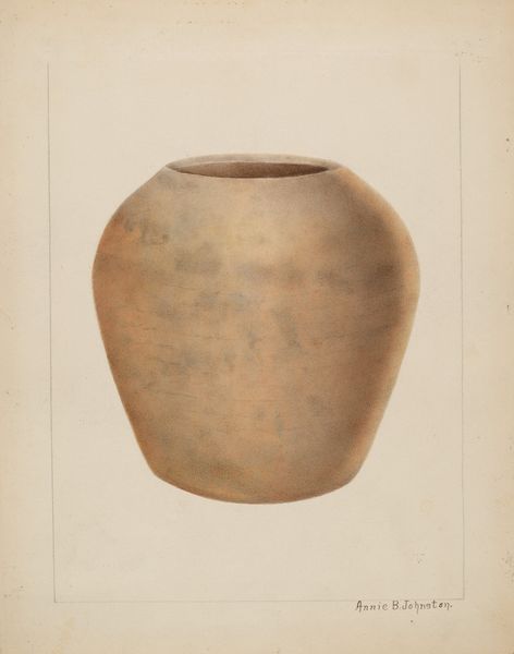 Editor: We’re looking at V.L. Vance’s "Blue-green Flask" from around 1940, a delicate watercolor on paper. It’s simple, almost serene, and the way the light catches the glass is really quite lovely. How do you interpret this work? Curator: For me, it’s less about the serene surface and more about what the flask *represents* in its time. Think about the era, the shadow of war, resource scarcity… Everyday objects gain a heightened significance. What did it mean to carefully depict something so utilitarian during a period defined by massive upheaval? Editor: So, it’s a sort of quiet commentary? A subtle act of resistance? Curator: Exactly! It's a resistance against the erasure of the everyday, a reclaiming of beauty in the face of destruction. Consider the gendering of domestic space too, women holding the fort at home while men go to war; is it domesticity glorified or rendered precarious? Also, do you think the colour, green-blue, has a potential ecological message, maybe commenting on the scarcity and the responsibility toward nature and resources at hand? Editor: That’s fascinating. I hadn't considered the context of scarcity and gendered labour. It makes the image feel so much more loaded and complex than I initially thought. I saw tranquility, but you've opened up this whole conversation about resilience and the significance of the mundane. Curator: It also highlights the power of art to subtly critique, to record, and to reframe even the simplest of objects within a broader social narrative. By interrogating art this way, we better connect both the then and now, revealing continuities, and understanding the potential to resist systems of power. Editor: This makes me see all still lifes in a new light. Curator: That's the power of context, isn't it? To shift perspective and make visible the unseen layers.