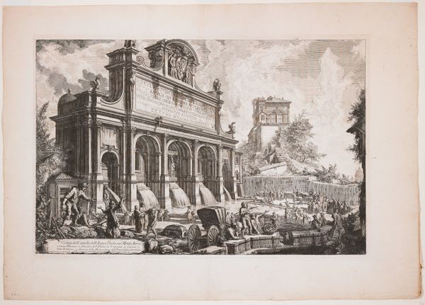 Editor: Here we have Giovanni Battista Piranesi’s "Vedute del Castello dell' Acqua Paola sul Monte Aureo," a cityscape made with etching and engraving in 1759. I'm immediately struck by the hustle and bustle captured in this architectural scene. How do you see this work in relation to its time? Curator: Well, Piranesi was fascinated by Rome, not just its ancient glories but also how it functioned in his own 18th century. This print wasn't just a representation, but a statement about the city's infrastructure and the papacy's role in shaping urban life. See the aqueduct dominating the scene? Editor: I do. It seems to emphasize civic improvement. Curator: Exactly. Public works like aqueducts and fountains were crucial for papal authority and public image. Piranesi isn’t just showing us a beautiful fountain; he’s illustrating the power structures at play. Notice how the figures in the foreground seem dwarfed by the architecture? It underscores the power of the institution. What does that dynamic evoke for you? Editor: I guess it creates a sense of awe, almost subservience, before this impressive feat of engineering, funded and enabled by powerful entities. And perhaps those people relied upon it every day. So this image almost memorializes that dependency? Curator: Precisely. These prints circulated widely, influencing perceptions of Rome throughout Europe. It helped to build a particular narrative around papal Rome, as being at once divinely ordained and publicly spirited. We can see Piranesi both as an artist and a skilled propagandist for a particular vision of Rome's sociopolitical structure. Editor: It’s interesting to consider how art is so much more than just the image itself. I’ll never see Piranesi's prints in the same way again!