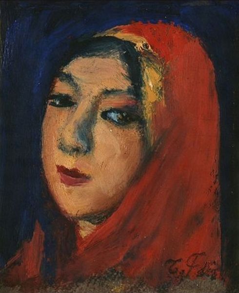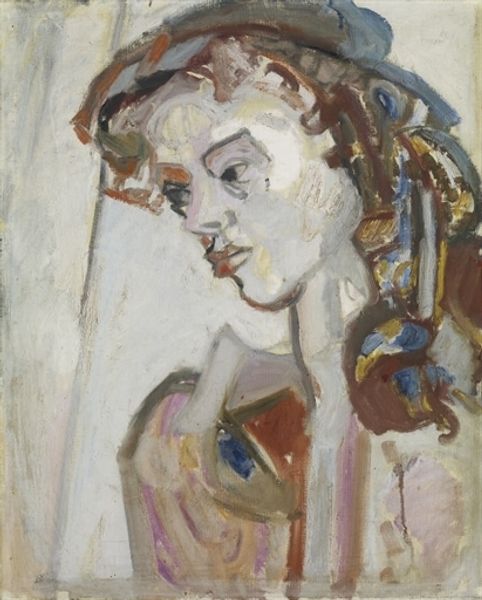 Curator: Here we have Edvard Munch's "Portrait of Model," an oil painting created between 1922 and 1923. Editor: It’s immediately striking – not necessarily for its beauty, but for this very specific atmosphere of unease. There's something subtly off about the proportions and the colors that creates this effect. Curator: The deliberate disharmony contributes much to the mood. Munch uses these vibrant yet somewhat clashing colors – the almost sickly green around the mouth, the streaks of red near the eyes – which challenge conventional portraiture and force us to consider more psychological depths. Editor: Right. Notice also the brushstrokes. They aren't blended to create a smooth surface. Instead, they're very visible, directional, almost frantic, giving the portrait a raw, unfinished quality, highlighting the subjective emotional state rather than photographic likeness. The structural asymmetry makes me question reality. Curator: Munch often aimed to portray inner turmoil and complex emotions. He may be delving into themes of alienation or even the fragmentation of self, as common to that historical time as Freud was revealing unseen portions of the mind. Editor: Do you mean she represents inner anxieties? That blue in the upper background seems so heavy, it creates the impression of suffocating. It also makes the work a symbolic presentation of psychological realities rather than a purely aesthetic depiction. Curator: Quite, the blue is symbolic and reinforces this almost dreamlike representation of self, something raw from deep in the sitter. The bold colors symbolize a turbulent inner world and it represents a psychological vulnerability. Editor: Exactly. When looking deeply at this composition, the clashing brushstrokes contribute to this sense of disturbance, evoking complex emotions regarding identity and perhaps questioning the essence of representation in art itself. Curator: It all points toward the artist's desire to depict emotion over simple form. The model is elevated to reveal the human soul and its complex symbolism through emotive forms, it does achieve his goal! Editor: Indeed, it’s unsettling, and memorable precisely because it deviates from classical conventions, inviting viewers to confront profound existential questions within the frame.