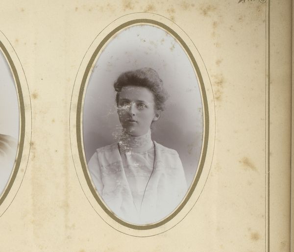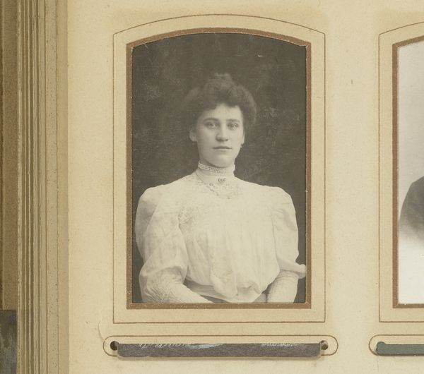 Editor: Here we have "Portret van Margo Kessler-de Lange," made sometime between 1880 and 1920, using the albumen print technique for photography. I find it strikingly delicate. What catches your eye in terms of its composition? Curator: Formally, I’m immediately drawn to the subtle tonal gradations within the albumen print itself. Observe the nearly monochromatic palette; it directs our focus to the texture and shape. Notice the slight asymmetry in the subject's pose and the framing of her face by her hairstyle. These contribute to a visual tension that complicates the otherwise straightforward portrait. Do you perceive how the artist guides the viewer's gaze through the arrangement of light and shadow? Editor: I see that now. It is mostly light, but then her eyes and hair anchor the composition, creating that tension you mentioned. Curator: Precisely. The restricted palette almost abstracts the figure. The artist focuses instead on geometric elements-- the rectangular frame versus the circular hairstyle, for instance. This allows the work to exist as more than a mere likeness; it becomes a study in form and texture. The artist creates formal harmonies even within this rather conventional style. Editor: That's a great point. I was focusing on the person, but it's fascinating to consider how the textures and shapes create so much visual interest in what I had perceived as just a pretty picture. Curator: Exactly. And by understanding how visual elements create form, the artistic intention starts coming into focus as well. Editor: I've definitely learned to see the interplay of shape and light, creating almost a geometry to the photo beyond just a document.