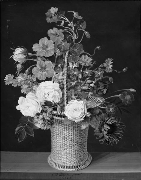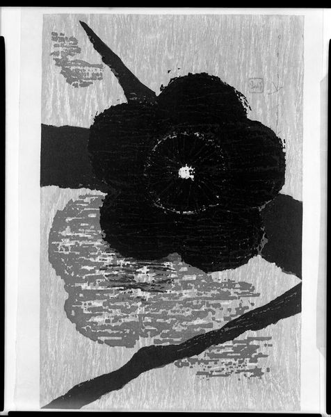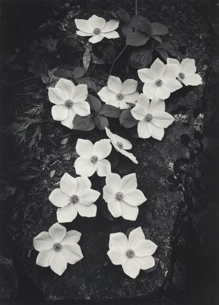 Editor: This is Sarah Choate Sears's gelatin silver print, "Untitled (hibiscus floating in a glass)." The flower seems to be suspended, almost weightless. What stands out to you? Curator: Consider the hibiscus: in many cultures, it symbolizes delicate beauty and fleeting moments. Sears presents us with a loaded symbol, doesn't she? Editor: Loaded how? Curator: Water, often a symbol of purity and reflection, here contains the hibiscus, a flower associated with both love and the ephemeral. Do you notice the mirroring of the flower's shape in the glass itself? Editor: I see it now, yes! It's interesting how the glass both holds and distorts the image. It gives the flower an ethereal quality. Curator: Exactly. It's an image of transient beauty captured in a moment, a memento mori. Editor: I never thought of a flower photograph as a reminder of death! That really changes how I see it. Curator: It is all in the symbols present in art.