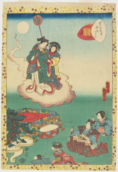 Curator: Allow me to introduce Utagawa Kunisada's woodblock print, "Hoofdstuk 40," created between 1851 and 1853. Editor: What strikes me immediately is the calculated chaos—the figures are deliberately placed in the composition, creating a sense of theatricality rather than naturalism. Curator: Indeed. The use of flat planes of color, particularly in the striped backdrop, creates a spatial ambiguity characteristic of Ukiyo-e prints. The lines, clean and precise, define forms but also contribute to the overall decorative quality. Editor: And consider the cultural context. Ukiyo-e prints gained immense popularity amongst the merchant classes. Their purchasing power rose and portraits became essential for showcasing status and beauty. Curator: Precisely. Kunisada, one of the most prolific designers of woodblock prints, masterfully combines portraiture with narrative. Observe the figures' elaborate costumes, the attention given to each fold and pattern. It is a celebration of surface and texture. Editor: Beyond surface, the subject seems to relate to theatre. This particular scene hints at the role theatre played in social discourse. The arrangement seems calculated to showcase performative identities as expressions of collective values. Curator: It is equally a representation of idealized forms. Every aspect is designed to convey a specific aesthetic sensibility and reflects broader cultural values and beliefs through this artistic medium. Editor: Right. Woodblock printing techniques permitted rapid reproduction and broad distribution, helping influence popular perceptions of class identity. Curator: Furthermore, the framing of the piece acts as a border and adds another layer to the flatness, contributing to the overall aesthetic impact and intensifying the interplay of colour and form. Editor: Kunisada truly captured a slice of life within a strict socio-political structure. The vibrant colours belie a structured representation. Curator: It's a captivating demonstration of art historical context meeting visual impact, don't you think? Editor: I couldn’t agree more; the analysis adds so much meaning to the print.