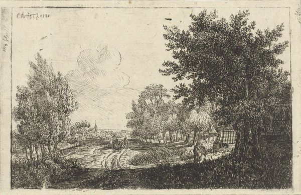 Editor: Here we have Johann Friedrich Morgenstern’s "Landscape," an etching dating back to the early 19th century. It's quite detailed, almost like a photograph in its precision. What kind of statement do you think Morgenstern was trying to make through this piece? Curator: This etching reflects a rising interest in nature shaped by Romanticism, but it also underscores the public role of art. How might exhibiting scenes like this influence urban viewers' perceptions of the countryside? Editor: So, it's more than just a pretty picture; it's shaping ideas about nature itself? Curator: Precisely. The etching suggests a controlled, idealized version of nature, potentially influencing policy and societal values. What do you think about that? Editor: I hadn't considered how art could be used this way. I'll definitely look at landscapes differently from now on. Curator: It highlights the power of imagery in shaping cultural narratives and environmental politics.