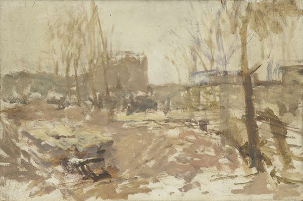Editor: This is George Hendrik Breitner’s “The Rokin, Amsterdam,” which was created sometime between 1880 and 1923 using oil paints. I am struck by the muted palette and the way the thick brushstrokes give a sense of movement, especially the way they capture the snow. What social narrative do you find encoded here? Curator: Breitner’s Amsterdam isn’t just a pretty picture. It’s a statement about a rapidly changing society, industrialization, and its effects on urban life. The impressionistic style almost feels… alienated. Does it evoke feelings of discomfort? Editor: A little, yes. It's not the idyllic snow scene I was expecting. It’s…bleak? Curator: Exactly! And that's significant. The working class were enduring very difficult lives at the time. Consider how the snow, often romanticized, is rendered here - not as pristine beauty, but almost like a veil attempting to soften the harshness. Can we see parallels between the oppressive weight of snow in the painting with, say, economic suppression? Editor: I see what you mean! The sketchy, unfinished quality emphasizes the ephemeral, transient nature of urban existence. It’s like he is capturing a fleeting moment in time. Curator: Precisely! The composition further drives the message. The Rokin, a central canal, should have been lively. But the cold, gray hues drain all its vivacity. Editor: So, Breitner isn’t just painting a pretty picture; he's holding a mirror up to society's underbelly. That’s very different from other Impressionists that I know. Curator: He makes us question the cost of progress, forcing us to confront social inequalities and their impact. It allows us to contemplate contemporary societal concerns and their effects on the populace, still very relevant today! Editor: I never thought of it that way before. It definitely adds a whole new dimension to understanding Impressionism. Thanks.