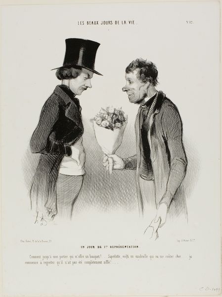 Editor: This is Honoré Daumier’s 1845 drawing, “Le Jour où il faut se montrer galant” - or, “The Day One Must Show Gallant.” It's a lithograph, I think, all in graphite and pencil. I am struck by how… cynical, almost, it feels. He's offering her flowers but both look so… unsure. What's your take on this scene? Curator: Unsure is a great way to put it! To me, it's dripping with societal pressure. Look at the woman's plain bonnet against the cascade of roses, and then the man, rigidly holding a tiny bouquet like it’s a bomb about to explode. He's fulfilling his duty to be 'galant', but the performance feels hollow, don't you think? The French title makes it clear what’s happening. Do you get a sense of everyday life portrayed in romantic idealism, versus stark social realism? Editor: Absolutely. The text underneath even suggests haggling, which punctures the romantic veneer entirely. The forced interaction is highlighted in his stiff posture versus her hesitance. He has to be gallant... but is he truly? Curator: Exactly! Daumier was brilliant at dissecting social hypocrisy with a witty but, I feel, kind eye. I wonder, looking at their expressions, can you see echoes of similar pressures in our own time, perhaps just repackaged? Editor: It’s everywhere, isn't it? The expectation to perform kindness and connection even when it's… complicated. Thank you; seeing it this way really brings the satire alive. Curator: My pleasure! It always gives me food for thought on modern interaction and if any of this awkwardness has shifted.