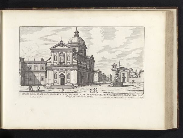 Giovanni Battista Falda created this print of the Chiesa di Santa Maria dell'Orto in Rome. The engraving captures the church's facade and adjacent structures, emphasizing a structured organization of architectural forms. Falda's technique relies on the power of line to define shape and space. Observe how the precise hatching and cross-hatching create a sense of depth and volume, characteristic of the period's interest in rationalizing space through linear perspective. The facade, meticulously detailed, presents a hierarchy of geometric shapes—squares, rectangles, and triangles—that create a balanced and harmonious composition. This structured approach reflects the prevailing intellectual climate, where clarity and order were seen as virtues. Note how the linear structure both represents and embodies a certain worldview. The detailed rendering invites us to analyze not just the appearance, but also the underlying principles of design and representation. The print serves not only as a visual document but also as a site for continuous engagement with the ideas of order, representation, and meaning.