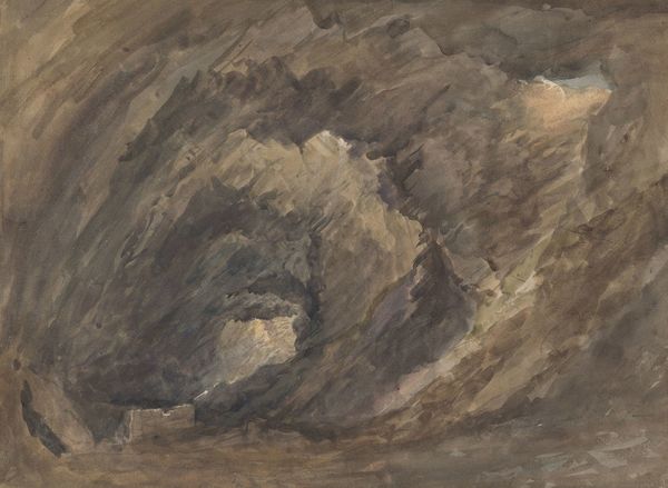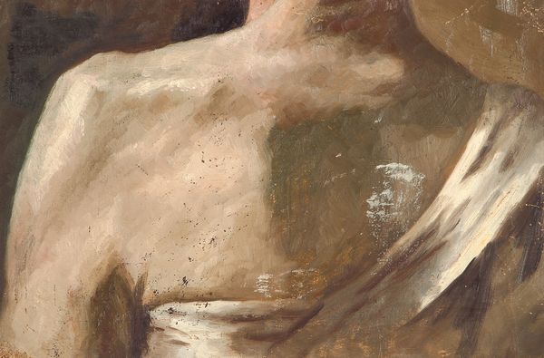 Curator: A rather subdued Seascape, believed to be by Jean-Baptiste Carpeaux. It is done in oil with quite a bit of visible impasto. Editor: It’s somber, definitely evocative. Almost monochromatic. What's most striking to me is the materiality, the way the impasto captures light. You can really see the movement of the artist's hand in the application of the paint. Curator: Yes, there's an undercurrent of Romanticism here. Think of the sea as this liminal space – a mirror reflecting our hopes and fears. Its inherent duality, the surface calm yet the depths unknown, offers symbolic possibilities. Notice the somewhat indistinct figures in the lower corner as well, almost dissolving back into the rock... it could imply that the sea is powerful, that we humans have limited impact or understanding of the ocean's expanse. Editor: Right, but look closer at the impasto itself. The texture wasn't just to add symbolic depth or atmospheric effect. It adds a real-world weight, almost blurring the line between painting and sculpture. The materiality fights the ethereal subject. What kind of brushes were available? Was it applied in a studio or en plein air and, if the latter, how would that have impacted the painter’s labour? Curator: It does have a solidity. Perhaps an anchoring point amid the swirling sea, preventing a total surrender to dreamy symbolism. The sea can act as the mother figure or some vast, all-encompassing deity or psychological space, after all. Editor: Precisely! These painters often prepared their canvases in advance, but with materials evolving, what was that initial connection to the canvas like? A fresh material experience would undoubtedly affect the artist's relationship with subject and space. Curator: A lot to contemplate... an ocean's worth, in fact! It’s like we're at that edge between sea and the earth, material, and ephemeral spirit. Editor: Definitely gives one food for thought. So many artistic and labor decisions led to the piece of work hanging before us.