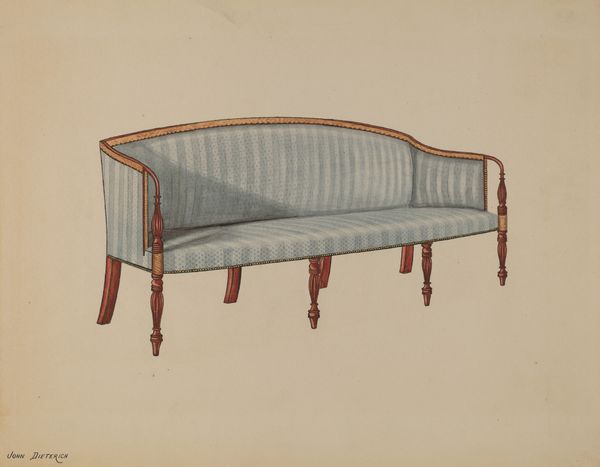 Curator: Florence Choate’s watercolor and drawing piece, dating from around 1936, presents a somewhat unassuming subject matter – a sofa. It's a fine example of academic art. Editor: The delicate rendering, the subdued palette... it evokes a sense of quiet domesticity. There’s a wistful feeling too. Almost as if longing for a comfortable respite in a world on the brink of something... perhaps before the storm of WWII? Curator: Absolutely, and one could argue the very act of documenting furniture elevates the everyday object. Consider the design itself, the carved wood detailing atop, and its social context as an object for the home, designed for leisurely conversation. Such an emphasis shifts our gaze to how domestic space shaped the role of women. Editor: Exactly! This is more than a sofa. It becomes a loaded signifier, whispering of gendered expectations within the household. Think of the ‘conversation couches’ of previous eras. In a world increasingly mechanized and industrialized, pieces like this perhaps offer comfort, privacy and status, speaking to a different vision of domestic life. It would be interesting to consider the class implications; what type of house was this sofa intended for? Curator: I agree, by displaying something this domestic and unassuming, we start to probe what "public art" really means and if all artwork ultimately conveys certain forms of value. Who gets to relax here, whose labor went into its production? And does this simple drawing, devoid of human presence, implicitly evoke these questions? Editor: Certainly. Its very stillness prompts inquiry, offering both solace and discomfort. I’m now picturing the ghostly outline of those who may have sat there… it makes you think about how material items contain traces of their users and the social lives those uses enable. Curator: I think you've broadened our view wonderfully! Editor: Thank you, likewise!
