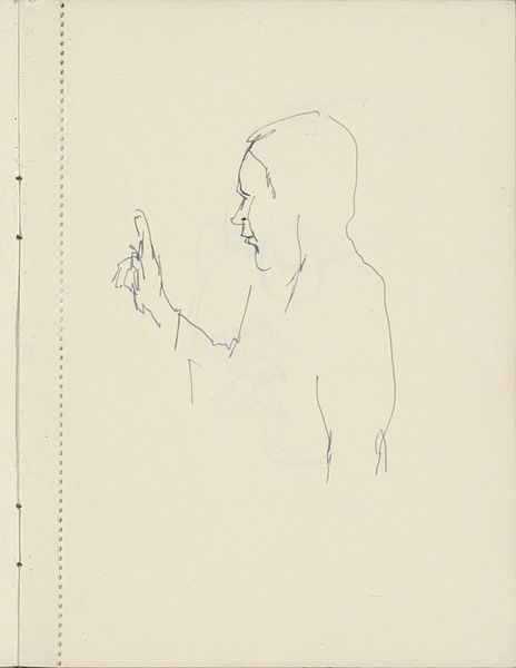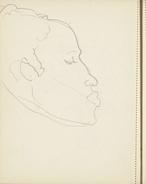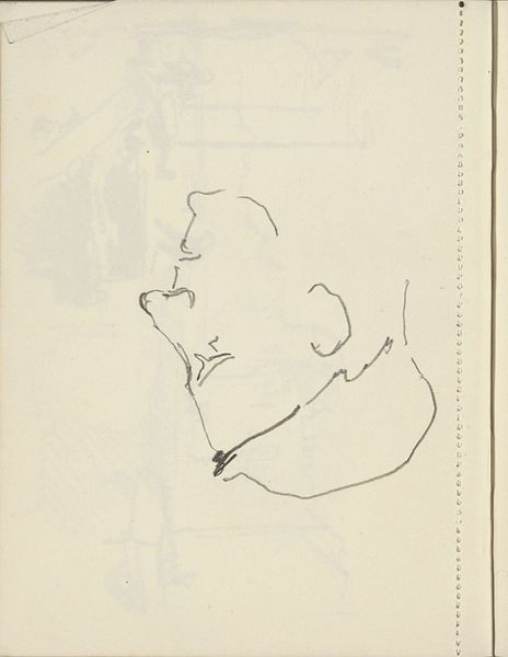 Curator: This pen and ink drawing by Cornelis Vreedenburgh, simply titled "Gezicht van een man, in profiel naar links," or "Face of a man, in profile to the left," dating roughly between 1890 and 1946, presents a rather striking image with such economy of line. Editor: It's…sparse. Almost ghostly. Just a contour, really, capturing the bare minimum to suggest a human presence. I can't help but wonder what the artist was thinking, who this man might be, or if it was even meant to represent someone in particular. Curator: That's precisely the charm, isn’t it? Its ambiguity invites projection. What societal pressures might have been weighing on this subject, only captured here in trace form? It makes you consider the absence as much as the presence, like a ghost of masculinity. Editor: Oh, that's an interesting angle. Considering how ideas of masculinity shifted around the turn of the century... but beyond that, this feels like a fragment, torn from something larger. Maybe the other drawings that fill this sketchbook could tell a more comprehensive story. Or do they only highlight the fragmented nature of our identities under increasingly mechanized regimes? Curator: Indeed, its existence within the sketchbook format indicates the intention behind its form. More process, less finality. This piece might've been purely to understand form in line. A minimalist response in resistance to the art that preceded him. Or is that too fanciful? Editor: Not at all. It also suggests that this man – his profile, his essence – was only worthy of a fleeting capture. The artist perhaps considered that masculinity isn't all that complicated. A couple of simple lines says all you need to know! The power, after all, lies in how we complete the sketch. What are your impressions as we prepare to move on? Curator: For me, this is a lesson in visual poetry. The suggestion of volume, emotion, humanity…all evoked with such spare means. I keep thinking of it as a delicate equation, where less is undeniably more.