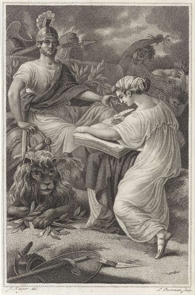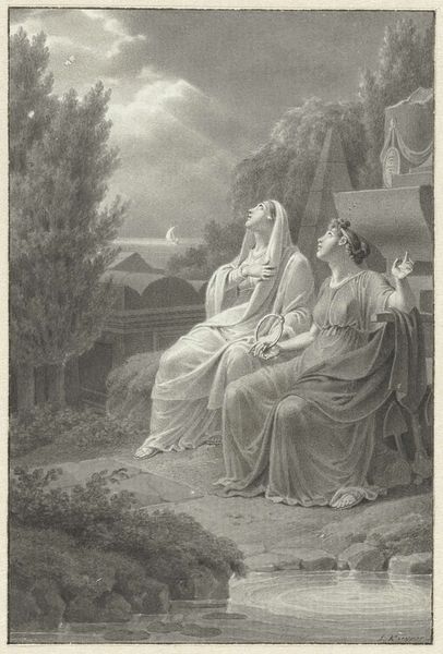Curator: Welcome. We’re looking at “Ontwerp voor een boekillustratie met een jong gezin en een vrouw met een fakkel,” a pen and pencil drawing by Jacques Kuyper, created sometime between 1771 and 1808. Editor: The torch immediately commands my attention, drawing my eye through the composition with its stark light. A rather dramatic opening, wouldn't you say? Curator: It is precisely that chiaroscuro which is so effective, creating dramatic tension in a seemingly tranquil scene. Notice how the classical figures are positioned in relation to the light source, the column, the overall pictorial structure of balance. Editor: Balance…but what sort of balance? It's clearly staged. Look at the drape of the clothing, probably made of simple linen or wool. These would have been hand-loomed. Were they common for Kuyper's patrons, and if so, how does that contextualize its reception at the time? Is there a relationship between social structure and production present in the piece? Curator: Intriguing perspective. Perhaps the implied textural details add to the drawing's layered formalism. What of the neoclassical elements – the serene landscape, the idealised bodies, the figures frozen in eternal harmony? Kuyper expertly manipulates the available forms. Editor: I grant you, its technique, composition, materials all contribute to the work's value as an artifact of artistic labor and of the production conditions available to the artists and even perhaps a signal about class. It makes you think, about material, about how the thing came to be. Curator: Perhaps. But let's consider also the conceptual underpinnings, the evocation of an ideal society – it transcends material conditions. The artist uses form, color values, to communicate meaning itself, at that conceptual level, rather than simple, social recording. Editor: Even the way those figures hold hands speaks about a material gesture though, right? Kuyper creates not just a record, but also a tangible experience mediated through those materials and their presentation, speaking, perhaps to family values of the rising bourgeoisie. Curator: Certainly, layers to consider. Editor: Always. Thank you for drawing my attention to the work today, that was clarifying and fun. Curator: The pleasure was entirely mine.