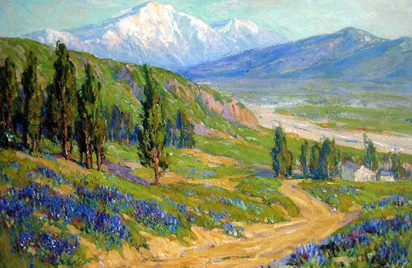 Benjamin Brown probably made this oil on canvas painting, Poppies and Eucalyptus, in California, sometime in the early 20th century. It depicts a landscape of orange poppies and eucalyptus trees, and is an example of California Impressionism, which was a popular style in the region at the time. This image represents a specific cultural and historical moment in California. During this period, Southern California was experiencing rapid growth and development. The art schools and societies that emerged sought to define a unique Californian identity through landscape painting. The poppy, in particular, became a potent symbol of the state's natural beauty. This idyllic view of nature promotes the idea of California as a land of opportunity and abundance. As art historians, we need to examine the social and institutional contexts in which this image was produced and consumed, consulting exhibition records, artists' biographies, and period publications to gain a deeper understanding of its meaning and significance. The image is a cultural artifact that reflects the values, beliefs, and aspirations of its time.
