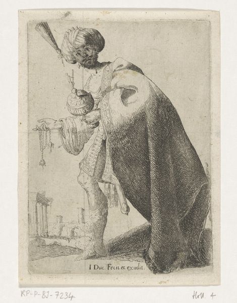 Editor: This engraving, "A Blind Man from the Quinze-Vingts Hospital" by Anne Claude Philippe Caylus, dates back to 1738. I’m struck by the directness of the gaze of the shorter figure, particularly contrasted with the other’s aloof profile. What do you see in this piece? Curator: I see layers of cultural encoding within what seems like a simple genre scene. The "Quinze-Vingts" refers to a Parisian hospital specifically for the blind, deeply embedded in the city's identity. What do the differing statures suggest to you? Editor: Possibly a dynamic of power, or reliance? The smaller figure is looking outward while being guided. Curator: Precisely! The staff acts as both physical support and a symbolic link to the world. Blindness itself carried heavy symbolic weight, often representing ignorance or a loss of spiritual sight. Yet, paradoxically, it could also signify heightened inner vision, an idea prevalent since antiquity. Notice the cup: a universal symbol for charity and reliance, it reminds us that compassion also served as a status display among the noble class. Editor: So the act of giving was as important as the care provided? Curator: Context is key. Patronage and religious piety informed daily life, providing tangible means of displaying social rank and individual faith, with symbols reinforced and understood by every member of the public. Editor: That reframes the entire work; thank you for illuminating those layers. Curator: Indeed, seeing beyond the surface opens new perspectives into how deeply symbolic meaning could be embedded within what appears to be merely an everyday portrait.