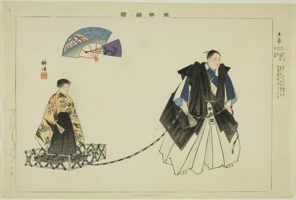 Curator: I’m struck by the composition; there's a quiet stillness in this print, but also an underlying tension with the arrangement of figures. Editor: You’re right, a study in contrasts indeed. This woodblock print, created by Tsukioka Kôgyo in 1898, is titled "Ashikari," part of his "Pictures of No Performances (Nogaku Zue)" series, currently held at The Art Institute of Chicago. It's a fascinating glimpse into the Noh theatre tradition. Curator: I am especially drawn to the execution of the robes. The rendering suggests complex layers of fabric. And, of course, we can't ignore the implicit cultural production embedded in woodblock printing as an inexpensive art form with a great history in Japan. Editor: The institutional context is also crucial. Tsukioka Kôgyo was consciously documenting Noh at a time when traditional arts were being challenged by Westernization in Japan. Think about the role prints like this played in preserving cultural memory. Curator: I wonder about the distribution. What was the audience for this series? Were they consumers of Ukiyo-e more broadly? Connoisseurs of Noh performance, or some new hybrid public brought forth by modernization? Editor: Excellent question. My reading points toward these works appealing to educated middle class seeking connection to tradition while embracing modernity. They offer carefully researched details of costume, stage setting and the actual plots. Curator: Right. Each character a sort of vessel for the rich social and performance-based histories you're hinting at. How are those histories accessed, bought, sold, experienced by varied audiences? I am less inclined toward the narratives themselves as an art form and much more focused on their social context. Editor: Well, narratives and their accompanying material productions become intrinsically connected in any attempt to establish collective identities and values, so your material focus here becomes even more revealing! Curator: Indeed, something to consider. This really has offered a new appreciation for both printmaking and cultural memory! Editor: Agreed! Seeing the image through both of our lenses shows how deeply embedded the socio-political environment is within each element.