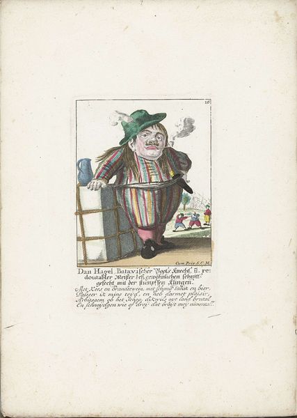Martin Engelbrecht created this print around 1710 using etching and engraving techniques, then added color by hand. These processes, while traditional, are here employed in the service of satire. The density of the etched lines defines the forms, especially the figure’s grotesque features. The hand-coloring, applied with care, gives the print its final character. The very act of printing and distributing such images reflects the growth of a media culture, a vital ingredient for early capitalism. Consider the labor involved: the artist’s design, the engraver’s skill, the printer's expertise, and the colorist's touch. Each stage represents a distinct contribution, much like the specialized roles in a factory. This division of labor allowed for mass production and dissemination of images like this one. Engelbrecht's print reminds us that even seemingly simple artworks are products of complex social and economic systems. By recognizing this, we can appreciate how such images helped shape public opinion and cultural values of the time.