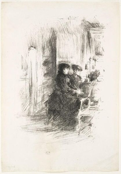 Editor: Here we have James Abbott McNeill Whistler's "The Duet, No. 2," currently housed at the Harvard Art Museums. It's difficult to get a sense of depth, it's almost flattened. How do you interpret the composition? Curator: Observe how Whistler employs a limited tonal range and delicate lines. The composition is less about representing a scene and more about exploring the relationship between form and space. Notice the subtle balance between positive and negative space. Editor: So, it's less about who these figures are and more about how they fill the space? Curator: Precisely. Consider the way Whistler uses line to suggest form, rather than define it explicitly. The emphasis is on the aesthetic experience, the arrangement of visual elements, and their intrinsic qualities. Editor: I hadn't considered it that way before. Thanks for pointing that out! Curator: My pleasure. Paying attention to form opens new ways of appreciating a work.