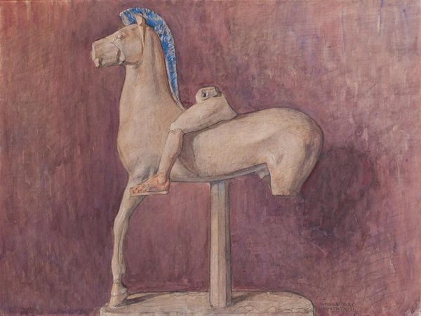 Curator: This piece, titled "The Acrobatic Agreement", was created in 2018 by Soltan Soltanli. It’s an acrylic on canvas work. What’s your initial take? Editor: Well, it’s wonderfully peculiar. There's a definite dreamlike quality, perhaps a touch surreal with the rather serious-looking acrobat perched precariously on that horse. Curator: Precisely. I find the symbology rich here. The horse itself, a frequent emblem of power and nobility, paired with the acrobat, representing skill and flexibility. It creates an interesting dichotomy, wouldn’t you agree? Editor: I do, and I think it poses some questions about control and freedom, power structures perhaps. Consider the acrobat's red outfit – a very striking color. What emotional resonances does it trigger for you? Curator: Red often signifies vitality, courage, even defiance. In this context, I see it as the acrobat's assertion of self atop this imposing creature. And notice how deliberately naïve the art is. It eschews standard painterly convention in favour of clarity of theme. Editor: The deliberately flattened perspective also adds to that naïve, almost childlike, feel. It's less about realistic depiction and more about communicating a concept or feeling. And the barren landscape. How does that figure into this narrative? Curator: The blank background isolates them, which accentuates the sense of the strange accord between the pair. The horse steps, or dances, seemingly without guidance or purpose, only furthering that reading. Editor: It brings to mind historical circus acts, but strips away all the glamor and fanfare, leaving a concentrated essence of… what? Endurance? The everyday absurdity of cooperation? Curator: Yes! The performance stripped bare, revealing the negotiations, the compromises that underpin any shared endeavour, even a seemingly impossible one. Perhaps "agreement" is less acrobatic than it appears. Editor: A compelling interpretation! I came expecting a light-hearted image, but now I see a much richer social commentary. It is indeed quite revealing how an unexpected combination can completely redefine the symbolism.