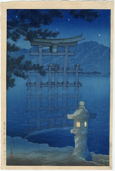 Editor: This is Hasui Kawase's "Kiyozumi Garden in Moonlight," a woodblock print from 1938. It’s so serene; the colors are muted and the composition is very balanced. How do you interpret this work, thinking about its historical and social context? Curator: Ukiyo-e prints like this were originally mass-produced and relatively inexpensive, often depicting scenes of everyday life and landscapes. But by the early 20th century, their popularity had declined. Prints like Hasui's represent a conscious revival of this tradition, specifically aimed at a middle-class audience that had both the leisure time and the money to consume these images. What do you think that says about the perceived value of art during that period? Editor: I guess it shows a desire to connect with traditional Japanese culture during a time of rapid modernization. Were these images also circulated internationally? Curator: Exactly! The revival of Ukiyo-e was fueled, in part, by Western interest in Japanese art. This print would likely have been marketed as an authentic piece of Japanese culture, promoting a specific image of Japan to both domestic and international audiences. Consider the way the lantern and the carefully manicured garden reinforce ideas of tranquility and traditional aesthetics. Does this strike you as entirely genuine or perhaps somewhat staged for an outside perspective? Editor: It’s interesting you point that out. Seeing it through that lens, it seems almost like a carefully constructed postcard of "old Japan," designed to appeal to certain expectations. Curator: Precisely. And recognizing that layer of constructed imagery helps us understand the role of art in shaping national identity and cultural tourism during that period. Editor: This has really opened my eyes. I’ll never look at Ukiyo-e the same way again. Curator: And I now better appreciate the role the print played in a cultural landscape during a complex historical period.
