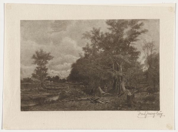 Frederick Juengling created this untitled New York landscape print sometime during his career. As you observe this monochromatic scene, note how the artist uses the etching technique to create varied textures that define the spatial composition. The use of finely etched lines capture the roughness of the bark, foliage, and grasses, creating a sensory experience. Consider how Juengling balances the density of the forest against the open sky to structure the landscape. The dense foreground of trees and fallen logs gives way to a middle ground of open fields and then dissolves into the sky. These layers create depth and lead the eye through the composition. The artist plays with light and shadow, carefully etching to emphasize the contrast between the shadowed foreground and the softer sky. In its entirety, Juengling's formal structuring of space conveys the experience of being in a tranquil landscape, structured yet ever-changing.