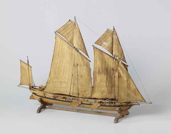 This model of a gig was made at Rijkswerf Vlissingen, a Dutch shipyard, and it gives us an insight into the labor, materials, and techniques involved in shipbuilding. The model is crafted from wood, likely shaped using traditional woodworking tools. The hull's smooth curves required skilled hands, and the intricate details of the rigging and sails showcase the artisan's mastery. The use of wood, a natural material, connects the ship to the environment and highlights the importance of resources in maritime industries. But a shipyard is also a factory, where the romance of the open sea meets the hard reality of repetitive labor. Whether the model was made as a conceptual exercise, or as a display of the yard's capabilities, it reminds us that even the most beautiful objects are born of human effort. By appreciating the craftsmanship in this model, we recognize the value of skilled labor and challenge traditional distinctions between fine art and craft.