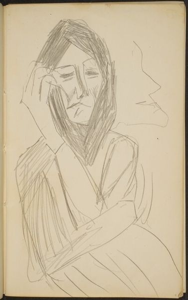 Curator: Before us is "flüchtige Halbfigur mit Kopftuch (Woman with a Headscarf) [p. 7]", a compelling sketch attributed to Max Beckmann. It’s rendered with pencil. Editor: There's a haunting quality, isn't there? The lines are so delicate, yet the subject's gaze feels intense. The quick, light sketch creates such a mysterious feeling, it suggests fragility and even transience. Curator: The "Woman with a Headscarf" certainly evokes a powerful sense of humanity, reflecting the artist’s commitment to figuration at a period that prized pure abstraction. Beckmann's portraits often challenged bourgeois society, showing them everyday subjects rather than idolizing them. Editor: That headscarf—a seemingly simple element—carries a lot of symbolic weight. Headscarves have different meanings in different cultures; it will denote devotion, piety, protection, and anonymity, which gives us much to think about when contemplating the drawing's emotional undertones. It makes her simultaneously visible and shielded. Curator: Exactly! Beckmann situated his works within the broader context of post-World War I German Expressionism and New Objectivity. Beckmann used the headscarf motif in portraits that challenged established norms and societal anxieties around the role of women. His unflinching focus gave women a distinctive cultural role after wartime displacement. Editor: I wonder if the fleeting nature of the sketch mirrors something about the subject’s own life. It evokes a sense of passing encounters and memories which connects it to our modern struggles for a home. Curator: It prompts consideration of the cultural, gendered role imposed on people who, willingly or unwillingly, became refugees within the nation-state. It is through artworks like this that people challenged the very definition of national identity. Editor: And it is fascinating how a mere drawing becomes a mirror reflecting our personal associations and memories connected to such images. It almost seems unfinished, urging the viewer to imagine her story further. Curator: Well said. The drawing encapsulates how German Expressionism created works that challenge the viewer. Editor: The visual language of German Expressionism leaves us much to contemplate about modernity.