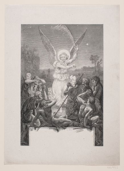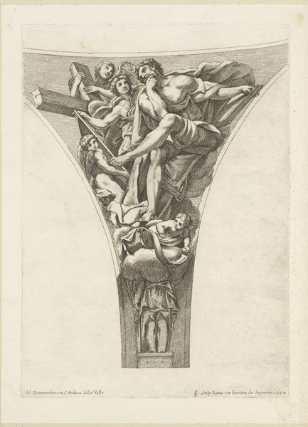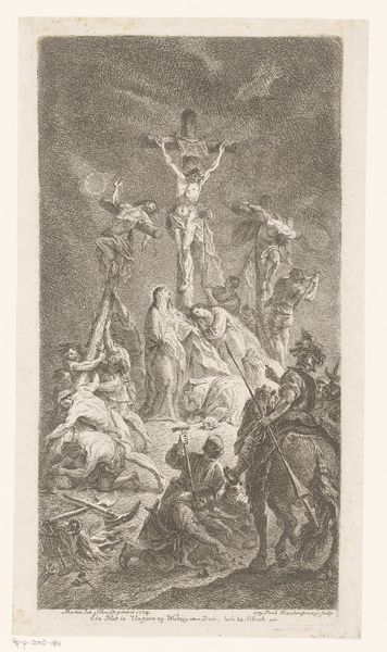 Editor: Here we have Reinier Vinkeles’ “Christus aan het kruis,” or “Christ on the Cross,” created in 1797. It’s an engraving, a print. The scene is obviously Christ’s crucifixion, but the mood is more detached, almost clinical, than I expected. It is not overtly sentimental or emotional like other paintings I have seen on the topic. How would you interpret this work? Curator: Well, first off, it's important to remember we're looking at a print, an engraving, not a painting. Vinkeles was a master printmaker, and that line work, that cool precision, is his strength, isn't it? Think of it as a snapshot of a pivotal historical moment, presented for thoughtful contemplation rather than raw emotional response. It almost has this removed effect. What strikes you about how the figures are arranged? Editor: I notice Christ is very central and upright, more like he's reaching up than sagging. And those figures gambling at the bottom... It’s like life going on right in front of death. Curator: Exactly! That contrast is key. And see how he places the other two crucified figures further back, almost obscured. Vinkeles isn't just illustrating a Bible story, is he? He’s staging a scene, thinking about perspective, about the details the viewer can glean at a specific location. Is that how it feels? Editor: Yes, it is. I did not catch the perspective. Now the contrast of life and death as you mentioned feels intentional rather than implied. Curator: The image is also, more than the dramatic climax, a chance to examine human behavior. To me, the print poses quiet questions rather than shouts answers. Editor: I was so focused on the central figure I didn’t really examine the smaller vignettes. I guess that's a lesson in paying attention to detail! Curator: Absolutely. And sometimes the most profound emotions are the ones that sneak up on you, just like those details in the background, no?
