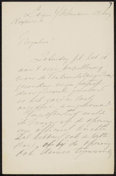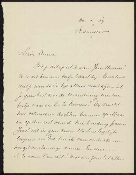 Curator: Here we have Catharina Alberdingk Thijm's "Brief aan Philip Zilcken," likely penned around 1887. It's ink on paper, showcasing the artist's elegant script. Editor: Immediately, I'm struck by the almost ethereal quality. The faded ink and delicate curves of the handwriting create a sense of intimacy and perhaps a touch of melancholy. Curator: Yes, there's a beautiful fragility. Notice how the ink bleeds slightly into the paper. This emphasizes the personal nature of the letter – you can almost feel the pressure of the pen on the page. Semiotically, we are witnessing an intersection between hand-drawn types, mark-making, and the very body of the author in time and space. Editor: I'm curious about the intended recipient, Philip Zilcken. Was he a friend, a colleague, or a potential patron? The letter gives off the energy of being about working together to write a periodical for “young people of good society”, it feels as though they would be working together, or she is offering to help with this task. It hints at a world of intellectual exchange and creative collaboration, don’t you think? Curator: Precisely! Zilcken was an artist, critic, and writer, making him the natural choice of whom she could address with her ambitions of writing the literary magazine. Consider this handwritten format: it suggests something uniquely informal at the time, though commonplace today given our handwritten notes from the late 1880s still find readability today. It represents much of the artist's social sphere during that time period. Editor: There's a lovely contrast, isn't there, between the formal script and the likely informal context of a personal invitation. One almost wants to be invited into the world of salons and literary discourse, like a snapshot from a period drama about creative people sharing big thoughts in gilded drawing rooms. Curator: It certainly transports us. Looking at this letter today allows for a special perspective into that exchange between both writers and the more delicate sentiments on display for a creative collaborator. I'd like to imagine what came next for these writers now. Editor: A touching piece that brings the past to the present.