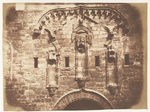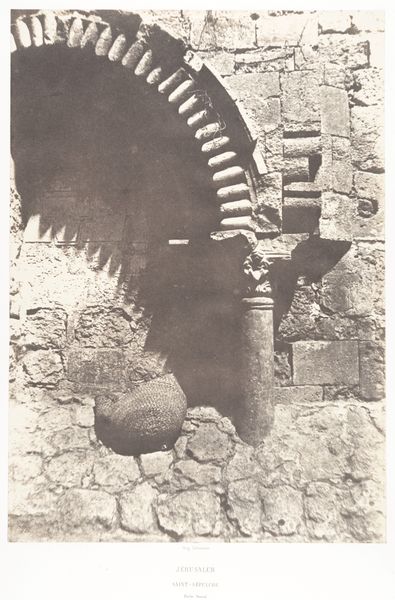 Editor: This is "Jérusalem, Saint-Sépulcre, Détails de la porte," a gelatin silver print taken by Auguste Salzmann sometime between 1854 and 1859. There's such an intense sense of history and texture here. It's hard to believe it's a photograph; it almost feels like I’m looking at an architectural drawing. How do you read this work? Curator: Salzmann’s photographs of Jerusalem are particularly fascinating when we consider the burgeoning European interest in archaeological and biblical sites during the mid-19th century. He wasn't simply documenting; he was participating in a wider project of constructing and reinforcing certain narratives about the region. Do you notice how he isolates this particular section of the door? Editor: Yes, it really emphasizes the details – the carved capitals, the texture of the stone… Curator: Exactly. Consider the historical context: photography was still a relatively new medium. By focusing on architectural details like this, Salzmann almost lends a scientific air to his work, reinforcing the idea of objective documentation. Yet, this image also played into colonial power dynamics. Whose story was being told, and for whom? Were these images intended to foster understanding, or to subtly assert dominance through representation? Editor: So, it's less about pure representation and more about shaping perception, even back then. Curator: Precisely. It's about controlling the narrative. These photographs were not just seen; they were consumed within a very specific European intellectual and political landscape. This work contributes to the construction of an orientalist discourse. What do you think of the public perception and access of such imagery? Editor: That makes me rethink my initial reaction. What seemed like simple documentation now appears loaded with implications about power and representation. Curator: And that is precisely the importance of looking beyond the surface and considering the social and political context in which art is created and received. Editor: Thank you. Now, seeing through the lens of colonial power, it has become so much more than beautiful stonework to me.