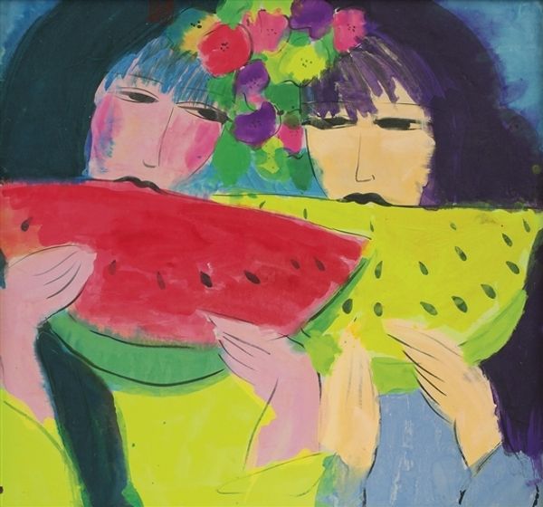 Editor: Here we have Walasse Ting's "Women with Fruit," created in 1988 with acrylic paint. The vibrant colours and simplified forms give it a very playful feel. What do you see in this piece? Curator: This piece speaks volumes about the male gaze, doesn’t it? We're presented with a reclining nude, surrounded by symbols of fertility and abundance, but also perhaps confinement. Consider how the pop-art style, while seemingly joyful, flattens and objectifies the female form. What does this suggest about the societal role imposed upon women, even celebrated women, during the late 20th century? Editor: That's a perspective I hadn't considered. I was mainly drawn to the bright palette, how the pinks and purples interact with the more acidic greens and yellows. Are you saying the artist’s choices of colour and style might actually reinforce those power dynamics? Curator: Exactly. The naivety associated with Fauvism and Pop Art can be deceptive. Think about the male artists who dominated those movements, and how their depiction of women often reflected prevailing patriarchal values. Is Ting subverting those tropes, or perpetuating them? How do the symbols of fruits traditionally being equated with femininity and temptation affect your reading of the subject’s posture? Is she reclining freely, or is it a staged pose? Editor: It’s definitely made me reconsider my initial reading of the painting. I was so focused on the aesthetics that I overlooked the potential social commentary. Curator: Art can be a mirror reflecting not only beauty, but also uncomfortable truths. By critically engaging with these visual cues, we can unearth layers of meaning related to identity, gender and power. It reveals as much about us as the subject. Editor: I’ll definitely look at art differently from now on. Thanks for broadening my perspective!