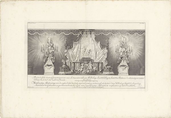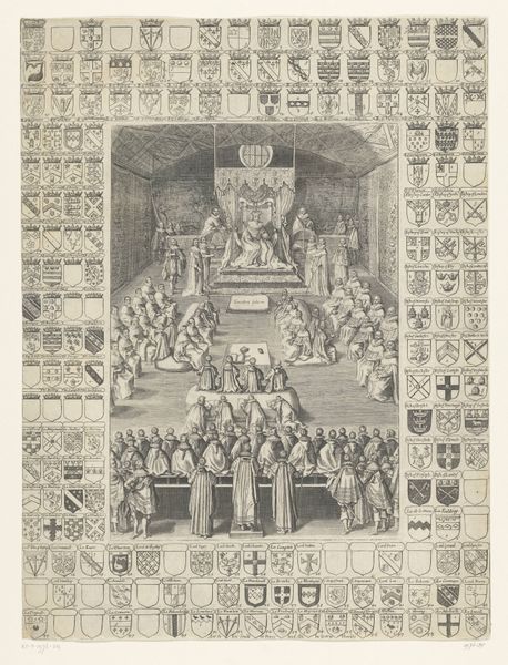 Albert Haelwegh made this print of Henrik Lindenow’s lying-in-state sometime in the mid-17th century. The image commemorates a member of the Danish nobility, and the scene is replete with symbols of wealth and status. Lindenow’s coffin is draped in black and surrounded by candles and mourners. Heraldic shields, possibly representing family ties and achievements, adorn the scene, reinforcing Lindenow's lineage and social standing. Prints like this one served as powerful tools for shaping public memory, reminding viewers of the established social hierarchy. They would have been commissioned by those with the resources to influence perceptions of power and legitimacy. To fully appreciate this print, one might delve into the history of Danish nobility. Archival records from the time, such as family trees, estate inventories, and official decrees, could shed light on Lindenow's place in society and the values that this image was intended to convey. Understanding the institutional history behind these prints, their patrons, and their intended audience, deepens our appreciation for the social and political role of art.