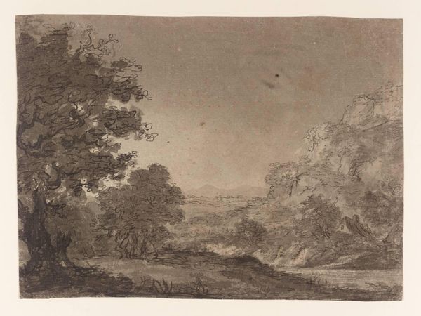 Curator: Here we have an etching from the Tate collection by Alexander Cozens, who was born in 1717 and died in 1786. Editor: It feels like a dream. The monochromatic palette gives it a kind of ghostly, ethereal quality. Very atmospheric. Curator: Cozens' landscapes often use these simplified forms. The trees, for instance, become almost emblematic. What do you make of that? Editor: It feels intentional, like he's trying to tap into something deeper than just the surface of the landscape. More about the feeling than the fact. Curator: The etching process allows for such fine detail and subtle gradations of tone, a perfect match for his vision. Editor: It’s true. It feels like I’m standing in a memory. It lingers. Curator: Definitely evocative. Editor: Right, and I can feel it in my bones.