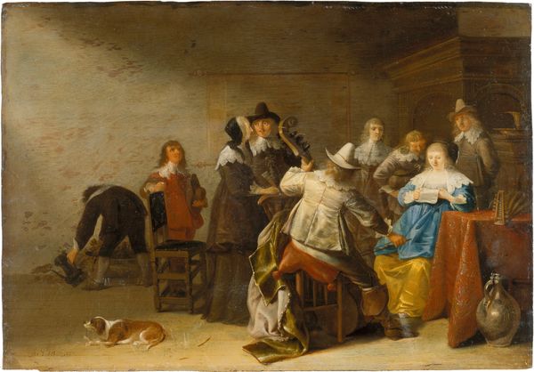 Curator: Let's discuss this captivating scene of leisure. Painted around 1650 by Vincent Malò, it's called "Two Men at Cards Outside a Country Inn," executed in oil on canvas. What strikes you upon first viewing it? Editor: It's the mood—relaxed, worn. Like a stage set where life just meanders along. All those smoky colors, almost like a sepia photograph from a long-lost summer. Makes you wonder what stories those weathered faces hold, doesn't it? Curator: Exactly. Malò really captures that taverns of the mid-17th century, as sites for social interaction and negotiation of daily life, where individuals came together over games, food, drink, and conversation. Notice the carefully crafted details, like the figures and simple pottery which adds a layer of authenticity. Editor: And that little dog! Scratching away like the world depends on it, totally oblivious to the dramas unfolding at the card table. It's charming and almost perfectly out of focus. But you can almost feel the dust in the air. It feels…lived-in, somehow. Curator: We can infer that Malò’s selection of materials and brushwork— the type of canvas and the pigment, the loose, layered strokes used to create depth—reflects the painting materials available, but is also consciously employed to evoke texture. He is almost drawing a social history of labor practices, right there in that paint. Editor: It's curious, though, how much he focuses on these almost portrait-like depictions and ordinary scenes. Was he glorifying or perhaps gently critiquing the everyman, I wonder? There’s a warmth to the whole scene but perhaps an invitation to reflect. Curator: Perhaps a bit of both. He depicts life as it was. Not only is the choice of scene relevant to our understanding, but the physical nature of the oil on canvas itself reveals information, for it points to that transition between production of artworks and their sale and trade. Editor: Hmm, interesting points! All this talk about labor makes me wish I could just slip into that painting and enjoy the quiet of that evening air. Thanks for that deeper perspective. Curator: And thank you for lending it a human dimension. I leave thinking that there is much to unravel still.