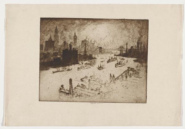 Editor: Here we have Joseph Pennell’s etching, "In the Mist of the Morning," created in 1908. The hazy, almost dreamlike cityscape is striking, with smoke billowing above the buildings. What kind of statement do you think Pennell was trying to make with this particular cityscape? Curator: Well, Pennell wasn't just depicting a city; he was capturing a specific moment in history – the dawn of the industrial age. Think about it: the "mist" could just as easily be interpreted as smog, a byproduct of unchecked industrial growth. It invites a critical reading of urban progress. What power structures are benefiting, and who is being marginalized or made vulnerable by this "progress?" Editor: So, the beauty is actually…deceptive? Curator: Exactly! It’s critical to remember that Impressionism wasn’t just about capturing beauty. It often hinted at the undercurrents of social change and technological advancement. This image, while visually captivating, hints at the environmental costs, and social inequities tied to rapid urbanization. Who has access to clean air in this vision of progress? Who is exposed to the industrial output on a daily basis? Editor: It sounds like he’s not necessarily celebrating this modern city. Curator: Precisely. By framing it "in the mist", he subtly critiques the consequences of prioritising industry over community well-being and sustainability. What would you say is revealed or concealed by the "mist" of the morning? Editor: That’s powerful. I’d always just seen it as an aesthetic choice, but understanding the social context makes me see it in a totally new way. Thank you! Curator: My pleasure. It's through these multilayered conversations that art truly comes alive, doesn’t it?