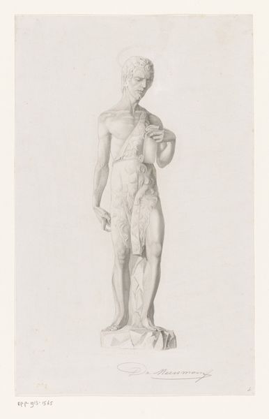 This is an undated drawing, "Standing Male Nude," made by Monogrammist AC (Jr.). It captures a figure reminiscent of classical sculpture through delicate lines in graphite. The artist masterfully uses light and shadow to define the nude male form, creating a sense of volume and presence on a neutral ground. The figure is posed with one arm raised, a gesture which draws the eye upward, while a draped cloth adds a dynamic counterpoint to the static pose, suggesting movement and texture. Note how the artist uses the semiotic language of classical art—the idealized body, the drapery—but reframes it through the immediacy of drawing. This piece exists in the tension between traditional forms and a more immediate, personal mode of expression, inviting us to consider how classical ideals are continuously reinterpreted through the artist’s hand.