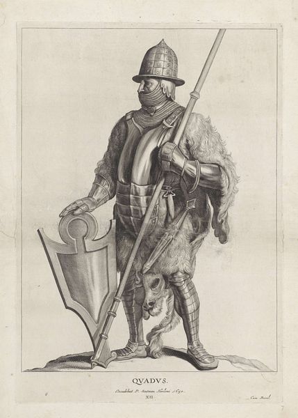 Editor: Here we have "Johannes Zisca," an engraving by Johan Friedlein dating from between 1685 and 1706. He's depicted in full armour, and there's something both imposing and slightly vulnerable about him. What stands out to you in this piece? Curator: The work, fundamentally, presents a study in line and form. Note the meticulous detail in the rendering of the armour. Friedlein employs varied hatching techniques to describe the metallic texture and the play of light across its surface. Editor: The cross-hatching is so precise! What about the subject himself, beyond just the armor? Curator: The figure’s pose is deliberately constructed, isn’t it? The weight is shifted onto one leg, creating a contrapposto effect, even if subtly so. This imparts a sense of dynamism, countered by the rigid verticality of the mace he holds. Editor: So it's almost like there is an interplay of motion and stillness... Curator: Precisely. Moreover, consider the spatial relationships at play. The figure occupies a shallow pictorial space. This compression focuses our attention on the intricate details of his person, forcing us to engage with the artist’s technique directly. Is this Baroque? Perhaps, although the pure study of form is paramount. Editor: That focus on the technique makes me see it in a new light, like the image itself. Curator: Indeed. By attending to the formal elements, the engraving transcends its subject, becoming an exercise in visual language.
