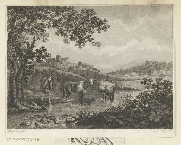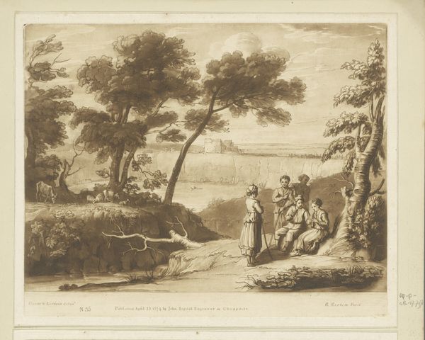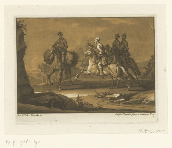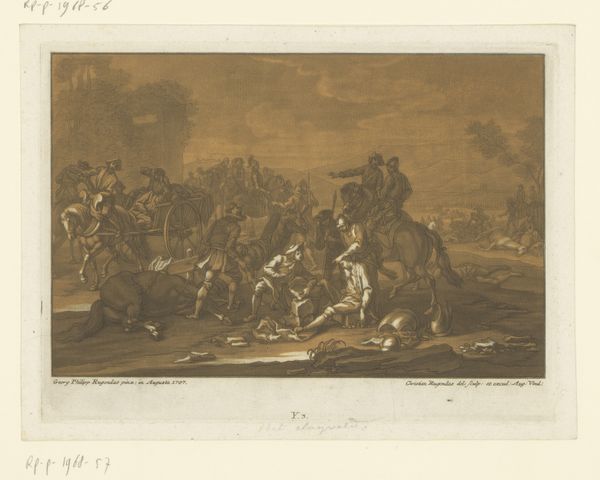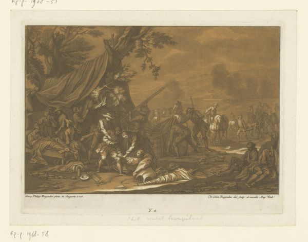 Curator: Good day. We are looking at "Verzorgen van de gewonden na de veldslag," or "Caring for the Wounded After the Battle," a drawing on paper rendered in ink by Christian Rugendas, dating sometime between 1718 and 1781. Editor: Immediately, the drawing strikes me as brutally melancholic. The landscape itself seems to sigh under the weight of so much human suffering, despite its small scale. Curator: Rugendas indeed conveys a certain weight, a kind of universal exhaustion, beyond just the physical suffering of the soldiers. Consider how genre and historical painting are intertwined. We have what seems like a straightforward battlefield scene, yet notice the baroque techniques – the dynamism, the attention to emotionality. Editor: For me, the process here is particularly resonant. We see the battlefield depicted through ink on paper – fragile materials describing violence. The creation process seems intentionally muted, reflective. You have the very delicate rendering of these men juxtaposed with their physical agony – and that’s what strikes you most. Curator: Exactly. The cultural memory embedded in war imagery often overlooks the individual. Rugendas centers on precisely those details. Note the symbolic weight, how, despite the apparent chaos, there's a very deliberate arrangement suggesting both the immediate aftermath of battle and an allusion to wider historical trauma. The tree could be an ancient witness. Editor: It’s all deliberately arranged, I agree. There is the very prominent location of that tilted wheelbarrow there…suggesting disrupted work, damaged tools. How much of war relies on such simple mechanisms of transport, or in helping hands? How the production and movement of supplies is integral to these scenes of utter destruction? Curator: Absolutely. And consider the deeper resonance – it calls into question what victory truly signifies, not only for those who were there on that very day, but also how wars continue to reverberate throughout society through visual symbolism. The drawing then transcends historical record; it serves as an archetypal vision. Editor: In that sense, thinking of the tangible and very present damage that occurs through even seemingly bloodless media, allows us to view how labor, representation, and historical realities always inevitably bleed together, not just in the aftermath. A reminder, I think, of our roles today. Curator: Indeed. A powerful and timeless commentary that reminds us to observe all perspectives. Editor: Agreed. Thank you for elucidating it, today.