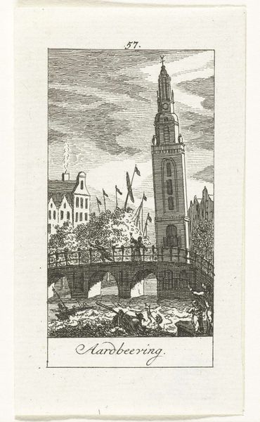 Curator: This is "Harfleur" by Alfred Louis Brunet-Debaines. It's held here at the Harvard Art Museums. Editor: It's a rather moody composition, isn't it? So much detail in the buildings, and then that striking vertical emphasis in the church spire. Curator: Indeed. Brunet-Debaines, born in 1845, was known for his etchings. The density of lines required significant labor. We can imagine the painstaking process, the artist's hand guiding the tool. Editor: The etching beautifully captures the play of light on the water. Note the contrasting textures and tonalities – the rough-hewn buildings against the almost ethereal spire. Curator: The etching process also enabled the wider distribution of images to a growing art market. It democratized access to art, moving it away from exclusive patronage. Editor: That spire undeniably serves as a focal point, directing the eye upward, toward a sense of something perhaps spiritual or timeless. Curator: Fascinating, isn't it, how one image can evoke such different readings based on our perspectives. Editor: It's the dialectic, then, between labor and light that keeps me coming back to this image.