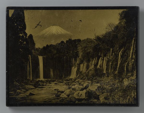 Curator: Oh, the colors. It strikes me as both imposing and somehow, serene. There's a stillness in the valley. Editor: Welcome. What stands before you is "Mountain Range", a work of oil on canvas by James M. Hart, dating circa 1850-1855. It currently resides here, at the Metropolitan Museum of Art. Curator: It’s like the mountains themselves are bearing witness, guardians bathed in the warm glow. The light… it almost feels divine. Editor: The luminescence, radiating primarily from the peaks, immediately grabs your attention. Hart's use of light establishes a clear visual hierarchy and dictates the rhythm of the entire composition. Curator: The way the darkness clings to the lower regions… I see it as symbolizing the unknown, or perhaps the challenges one must face to reach enlightenment, represented by those sun-drenched peaks. Remember, mountains have always held spiritual significance across cultures. Editor: Precisely, that duality is also reflected in the brushwork itself. Notice the loose, almost impressionistic strokes in the sky, creating a sense of movement and ephemerality, contrasted with the tighter, more controlled handling of the foliage and mountain details below. The artist employs contrast not only through subject but technique, too. Curator: The sky! Yes, a maelstrom of purples and reds. It suggests drama, perhaps a storm passing, but look how that turmoil resolves into this almost ethereal stillness where the light meets the mountaintops. It reinforces a potent spiritual symbolism where trials birth transcendence. Editor: Semiotically, consider the inverted triangular composition, rooted at the dark base, building upwards toward the apex of illuminated mountains: a visual metaphor, perhaps for aspiration, elevation, and overcoming earthly constraints? Curator: It resonates profoundly with the Transcendentalist movement of the time, that deep yearning for communion with nature and the divine... Hart captures that aspiration so well here. Thank you, the artist really conveys those nuances through form and symbolism. Editor: Indeed. Hart masterfully employed visual techniques to articulate ideas, creating an emotional, engaging landscape.