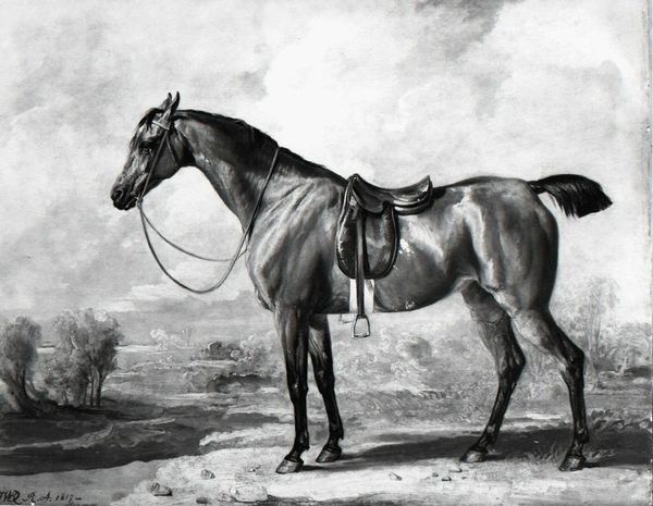 Editor: Winslow Homer's "Saddle Horse in Farm Yard," dating from around 1867 to 1875, captures a horse in what appears to be an idle moment, rendered in oil paint. I'm immediately drawn to the almost monochrome palette and how it affects the sense of light and shadow. What strikes you most about this composition? Curator: The stark contrast certainly dictates our perception. Observe how Homer orchestrates a visual hierarchy purely through tonal variation. The eye is led first to the dark mass of the horse, a concentrated form, and then diffused by the gradations of grey towards the lighter periphery. The structure is compelling; would you agree? Editor: Yes, definitely. It's interesting how that contrast creates a sort of visual tension despite the stillness of the scene. Does that limited palette speak to a particular artistic aim, perhaps beyond just realism? Curator: Precisely. Restricting the colour range invites a deeper exploration of form and texture. Consider the visible brushstrokes, particularly in the background foliage. They deny any illusion of smooth, mimetic representation, reminding us that this is, first and foremost, paint applied to a surface. This heightens our awareness of the artifice, a sophisticated, distinctly modernist move even then. What else grabs your attention? Editor: Now that you point it out, I notice the surface treatment more. The textures do add depth and almost a kind of energy to the piece. Thank you for clarifying Homer’s formal choices in the artwork! Curator: Of course. It’s the interplay between representation and abstraction, meticulously constructed using limited formal means, which makes it remarkable.