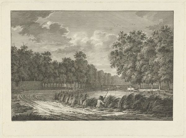 Søren Henrik Petersen made this print of Grib Forest, with a view over Esrum Lake to Fredensborg, using etching and engraving techniques. These processes involve covering a metal plate with a waxy, acid-resistant layer, drawing through it to expose the metal, and then bathing the plate in acid. The acid bites into the exposed lines, creating grooves that hold ink. The visual character of the print is directly tied to this process. The fine, detailed lines, especially in the dense foliage, testify to the artist's skill with etching and engraving tools. Look closely, and you can see how the varying depths and densities of these lines create a sense of depth, texture, and light. This wasn’t just a technical exercise, of course. The print medium allowed Petersen to reproduce and disseminate images of the Danish landscape, feeding into a growing sense of national identity. The labor-intensive process also speaks to the value placed on skilled craftsmanship in the creation and distribution of art at this time. By understanding the materials and making, we gain a richer appreciation for the artwork's cultural significance.