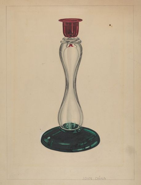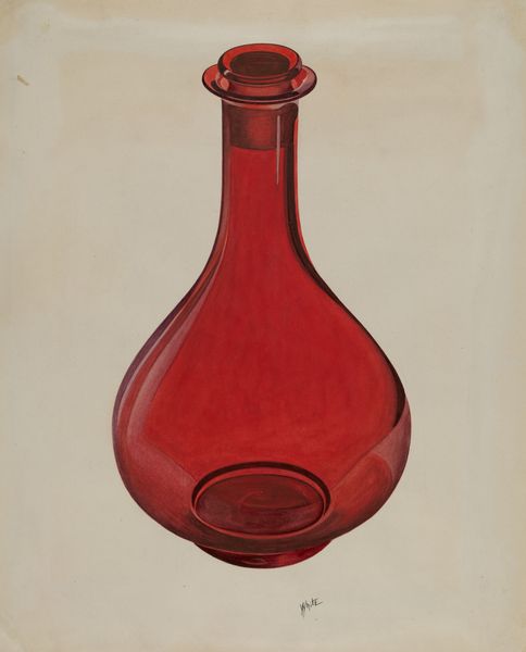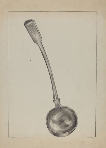 Editor: This is John Tarantino’s "Powder Horn," a drawing from around 1936. The object itself has such a smooth, flowing shape. What associations come to mind when you see this drawing? Curator: It immediately brings to mind questions around the concept of utility, especially in a historical context dominated by men and their access to resources like gunpowder. How was this powder horn adorned, used, carried? These were potent symbols, reflecting one’s status and connection to violent conflict, yet are often presented as simple craft. How can we disrupt that? Editor: That's interesting. I hadn’t thought about it in terms of its original function and symbolism, just appreciating it as a purely aesthetic object. Curator: Precisely. We often view these objects outside of their power dynamics. Who were permitted access? Who benefitted, and who suffered because of what this tool enabled? The craftsmanship itself could be interpreted through a gendered lens too. Editor: How so? Curator: Much like quilting and needlepoint were considered “women's work,” similar intricate crafting of items for male usage were either overlooked or celebrated under a patriarchal framework. Were these crafted by men? Are such skills less valuable simply because of gender? The drawing normalizes the aesthetic as masculine without such reflection. Editor: I see what you mean. So, looking at it now, it is no longer just a pleasing shape, but it makes you question who held the power to commission it, who was involved in its creation and use, and what social narratives are obscured through this presentation. Curator: Exactly! Objects such as these exist within intricate social fabrics. It requires a critical awareness that brings attention to the social imbalances present at the time of the object’s creation. It enables us to see the horn as more than mere utility. Editor: I hadn't thought of analyzing everyday items this way, so it's changed how I will approach these older art pieces in the future!