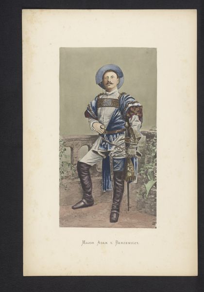Curator: Here we have a watercolor portrait, possibly dating from 1880 to 1884. It depicts Count Erwin Frederik Karel van Schönborn-Buchheim. What's your immediate take on it? Editor: It’s...surprisingly charming? There’s a theatrical air, the colours so gently muted. He looks like he's stepped out of some wonderfully obscure history play, though I’m not sure which one! Curator: That theatricality is interesting. Given the period, the elaborate costume points to a kind of historical reenactment, evoking a romanticized past. The watercolor medium softens the image, further lending it an air of wistful nostalgia. Editor: It’s definitely not striving for gritty realism, is it? More like a faded photograph of a stage performance. I imagine this sort of portrait functioned as a kind of social currency then. Did it reinforce existing ideas about status and lineage, perhaps? Curator: Absolutely. Portraits of this nature were often commissioned to assert aristocratic identity, harking back to perceived eras of nobility and chivalry. His very pose—hand on hip, steady gaze—it speaks of power presented as both natural and inherited. Even the somewhat self-conscious look helps! Editor: Yes, there’s a distinct "look at me, how wonderfully historical I am" vibe. But the lightness of the watercolour almost undermines that grand statement, don't you think? Curator: In a way, yes. It's as if the artist acknowledges the constructed nature of the image, the 'play-acting' element. Perhaps the family were keen theatre-goers. Perhaps, even, the portrait records a character played by Erwin Frederik Karel van Schönborn-Buchheim. Editor: It certainly raises all kinds of intriguing possibilities, and somehow that whisper of artifice makes it much more appealing than any straightforwardly pompous portrait of the era. Well, I'll certainly ponder that next time I attend the theatre myself! Curator: Indeed! It invites us to consider how we continue to construct and represent our own identities, even today.