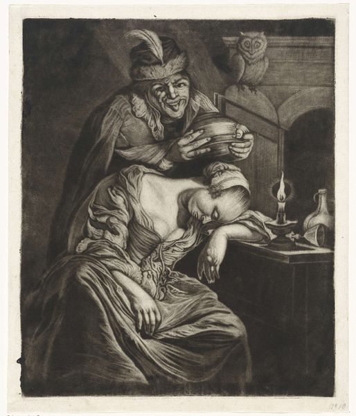 Cornelis Dusart etched this piece called "Monnik betast een vrouw" which shows a monk groping a woman, both laughing, in a circular frame. The rosary hanging from the monk's waist is a striking symbol, meant for prayer and devotion, now perverted into a tool of mockery. This inversion, a sacred object used in profane jest, echoes through time. Think of the medieval Feast of Fools, where church rituals were parodied, or the Renaissance Carnival, where social hierarchies were temporarily upended. Here, the laughter itself becomes a conduit, a primal release of societal tensions. Notice how the image plays on the subconscious, using humor to confront deep-seated anxieties about power, morality, and human desire. The act of laughter serves as both a release and a form of social commentary, a recurring motif in the theater of human life. The symbol, much like human nature, is in constant flux, forever caught in the cyclical dance of transgression and renewal.