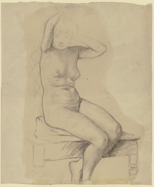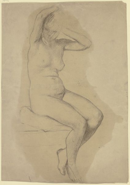 William Etty made this drawing of a seated nude female model with a high hairstyle, and an additional sketch, in graphite, sometime in his career. The drawing presents a study in contrasts between finished form and preliminary sketch. Notice the highly rendered figure in the foreground, modeled with careful attention to light and shadow. Beside the figure we see Etty's initial thoughts. The ghostly presence of the sketched figure and the anatomical studies of hands and heads give us a glimpse into the artist's process. The contrast invites us to consider how Etty thought through the interplay of form and space. The drawing can be considered an essay in artistic intention, a discourse between the complete and the incomplete. It reflects the artist's formal engagement with line and volume. The juxtaposition of a highly refined figure with initial sketches destabilizes the conventional relationship between the complete work and the creative process.