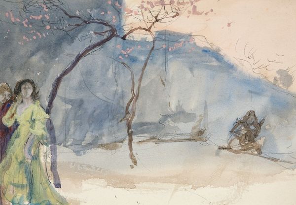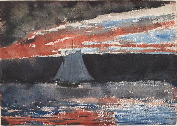 Curator: Jules Schmalzigaug's watercolor work, titled "Red Sailing Ship and Gondola", offers a fascinating glimpse into his artistic exploration. Editor: My first impression is a feeling of gentle melancholy, maybe tied to Venice itself. The watercolor bleeds together softly, almost like a fading memory. The red sail certainly catches the eye. Curator: Schmalzigaug was deeply involved with Futurist ideals, though he never formally joined the movement. One can see how the vibrant cityscapes and abstracted forms were vehicles to evoke intense, modern sensation. How might the symbolism be shaped, historically and personally, do you think? Editor: Water often symbolizes the unconscious, and boats transport us between states of being. Here, with that gondola quietly afloat and the bold red sail energetically piercing the scene, I read a personal navigation. Red is potent of course, life force, passion... a spirited self pushing through dreamy reflections? Curator: That’s astute, thinking about the artist's inner life reflected in a recognizable but also transformed urban scene. Historically, the image of the gondola and Venice was laden with romantic clichés; artists struggled to make it their own. In what ways do the abstract touches serve that struggle? Editor: By diffusing the specifics. It's less about a literal place and more about distilling a feeling *of* a place. The splashes of color become as important as the shapes. It feels almost as if the artist wanted to dissolve those heavy symbolic associations in favor of pure, emotional response. Curator: Schmalzigaug’s life, shadowed by periods of depression and culminating in his suicide, certainly colors how we see this dreamy vision. Do you find the knowledge of his life and death inseparable from the symbolism of the boat? Editor: It's hard to completely separate them, but maybe that knowledge enriches our viewing, highlighting the delicate balance between that energetic sail and the soft sadness around it. Maybe the imagery expresses not only hope or ambition, but the vulnerability inherent in pursuing such things. Curator: It shows us how much art's creation and reception exists within specific sociopolitical and biographical conditions. I think both his story, and his methods, invite introspection. Editor: Precisely. It's a lovely, mournful piece, isn’t it? Definitely makes you consider the waterways of your own emotional landscapes.