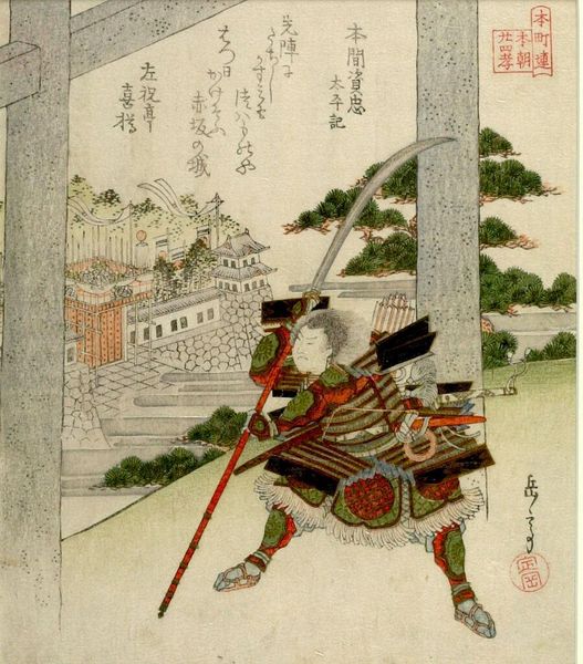 Curator: Katsushika Hokusai, famed for his "Great Wave," also created this print, "Festival Float of Priest JÅmyÅ," a vibrant scene showcasing costumed figures atop what appears to be a festive bridge. Editor: My eye is immediately drawn to the materiality—look at how the artist used paper and ink to depict the ornate armor and the bridge’s elaborate decorations. It evokes a sense of ritual. Curator: Indeed. The lines, though simple, create a dynamic composition. The figures, poised mid-action, convey a sense of drama through form and color. Editor: And consider the labor involved in both the depicted festival and the artwork itself. The printmaking process, the creation of the costumes… it speaks volumes about cultural practices. Curator: It’s a fascinating intersection. Hokusai’s mastery lies in balancing detail and abstraction to evoke a powerful visual narrative. Editor: Absolutely. This work reminds us that art is never just about the final image, but also about the hands, materials, and traditions that shaped it.