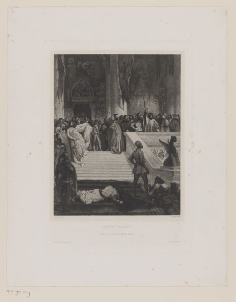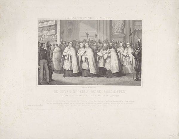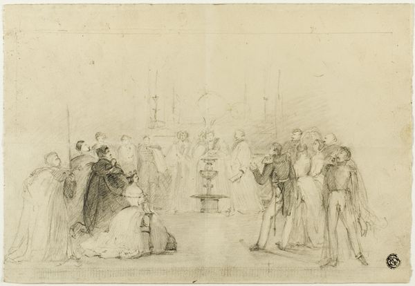 John Hayter created this print, "Christening of Edward VII," using a technique known as lithography. The magic of lithography lies in its directness. Unlike engraving, where the artist physically cuts into a plate, here Hayter likely drew directly onto a stone surface with a greasy crayon. The stone, probably limestone, would have been carefully prepared and treated so that only the drawn areas would attract ink. It’s a printmaking technique, and therefore suited to wide distribution, helping to shape and circulate notions of power, celebrity, and taste. The lithographic process allows for capturing the light and subtle gradations of tone, which we can see here in the robes and faces of the figures, and the way it captures a fleeting moment of royal ceremony. It democratizes the image in a way, making it accessible to a wider audience than an oil painting, but also reinforcing the social structures it depicts. Thinking about the materials and making of this print helps us understand its role in shaping public perception and royal power.