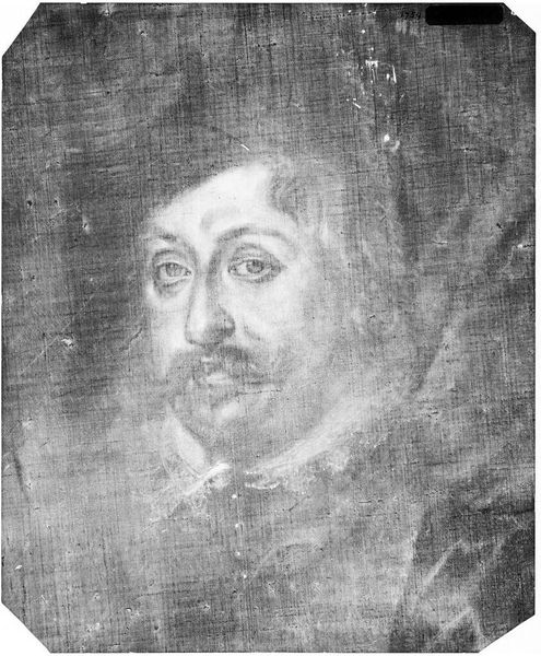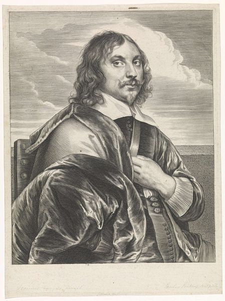Curator: This is Pieter Clouet's portrait of Christophe van der Lamen, now held in the Harvard Art Museums. Editor: I find his gaze quite direct. There's a sense of self-awareness that emanates from the image, doesn't it? Curator: Absolutely. Portraits like this were about crafting a very specific public image. Van der Lamen, identified here as a painter from Antwerp, is carefully presented. The buttons, the drapery—all speak to a certain status. Editor: Indeed, his hands are clasped over what appears to be a book or perhaps a portfolio. This hints at intellectualism and artistic skill, very deliberate choices. It is interesting how artistic identity was being shaped and presented at the time. Curator: The symbols, textures, and composition work together to construct a narrative about his artistic persona. Editor: It makes you wonder about the real person behind that carefully constructed facade. Curator: It does, doesn’t it? These glimpses into the past are always fascinating.