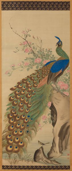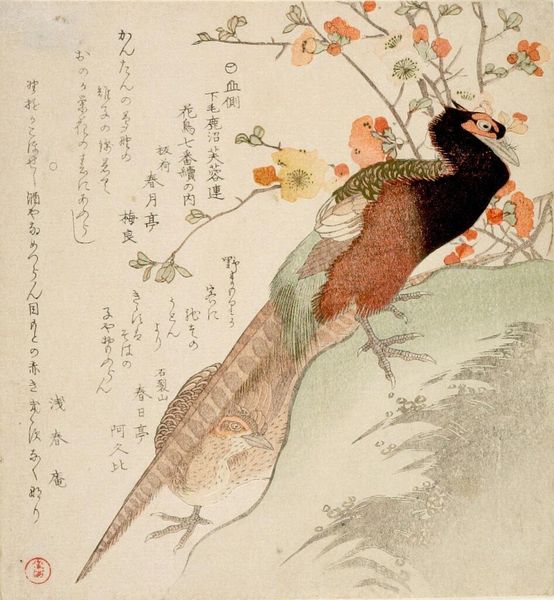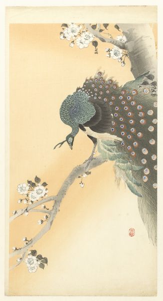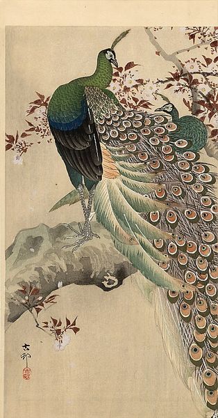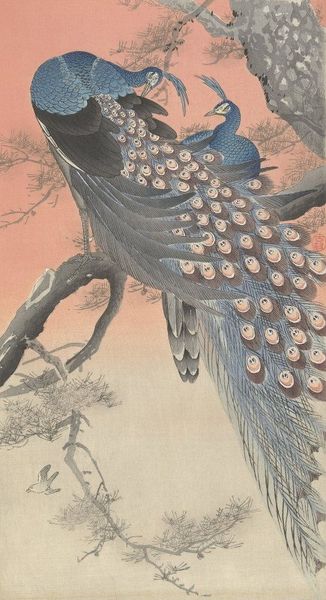 Ohara Koson’s print presents a peacock perched on a tree branch, rendered with vibrant colour against a muted background. The composition is vertically oriented, emphasizing the bird's elegant posture and the cascade of its plumage. The rich greens and browns of the peacock contrast with the softer tones of the branch and backdrop. Koson masterfully uses line and colour to define form. The peacock's feathers are meticulously detailed, employing curvilinear lines to create texture and depth. The tree's branches offer a structural counterpoint, grounding the peacock while leading the eye through the composition. This interplay between natural elements and meticulous craftsmanship echoes traditional Japanese aesthetics. The composition employs asymmetry to balance the visual weight of the peacock. The tree branches, rendered in darker inks, create a dynamic tension. This distribution suggests ideas around balance and harmony that goes beyond aesthetic appeal and serves as a reflection on the natural world, inviting contemplation.