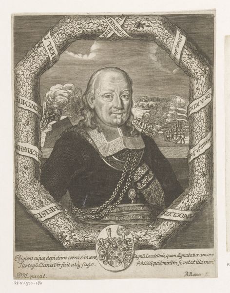 Curator: Augustin de Saint-Aubin created this engraving, titled *Portret van Petrus Johannes Simon van Eupen*, in 1790. It's part of the Rijksmuseum collection. Editor: It has a strangely ethereal quality. Despite the formality inherent in the portrait style and neoclassical frame, the sitter looks remarkably vulnerable. Curator: Absolutely. The oval frame—a motif echoing Roman portraiture—and the stone plinth certainly root it in Neoclassical tradition, invoking themes of civic virtue and reason. But observe how the symbols resonate beyond simple visual cues, evoking cultural memory and the enduring legacy of classical ideals. The subject gazes out in a way that appears, perhaps, searching, not regal. Editor: The “Charitas Articulat” inscribed on the plinth reads as both an assertion and a subtle commentary, especially given the complex social context of the late 18th century, a time fraught with pre-revolutionary tensions and anxieties regarding power and charity. One might examine how this choice frames ideas around social responsibility. It’s also hard not to read that text and elaborate frame as defenses—almost desperate assertions of legitimacy and status in an era that increasingly questioned it. Curator: Yes, the text and other visual clues become more significant in that respect. In the symbol itself, look closely, for example, at the armorial crest with what appears to be scales, hinting at a profession in law or justice. It’s also noteworthy that engraving was a medium often employed to disseminate images of the powerful. The visual language creates a lasting impression through symbolic layers. Editor: This makes me think about who had access to these images, and how class and identity factor in when trying to interpret the messages it was meant to send. If we consider that many were increasingly excluded from political or cultural spheres, this form of imagery had limited effect. This piece is very much situated within discussions on the limits of philanthropy, when considering inequality. Curator: Exactly. The artist used symbols of legacy, law, and, perhaps, social benevolence, as though crafting a narrative for both immediate consumption and posterity. Symbols as both affirmation and questions... fascinating. Editor: A tension that helps reveal broader patterns within the anxieties of the period, through the story of this person. Thank you.